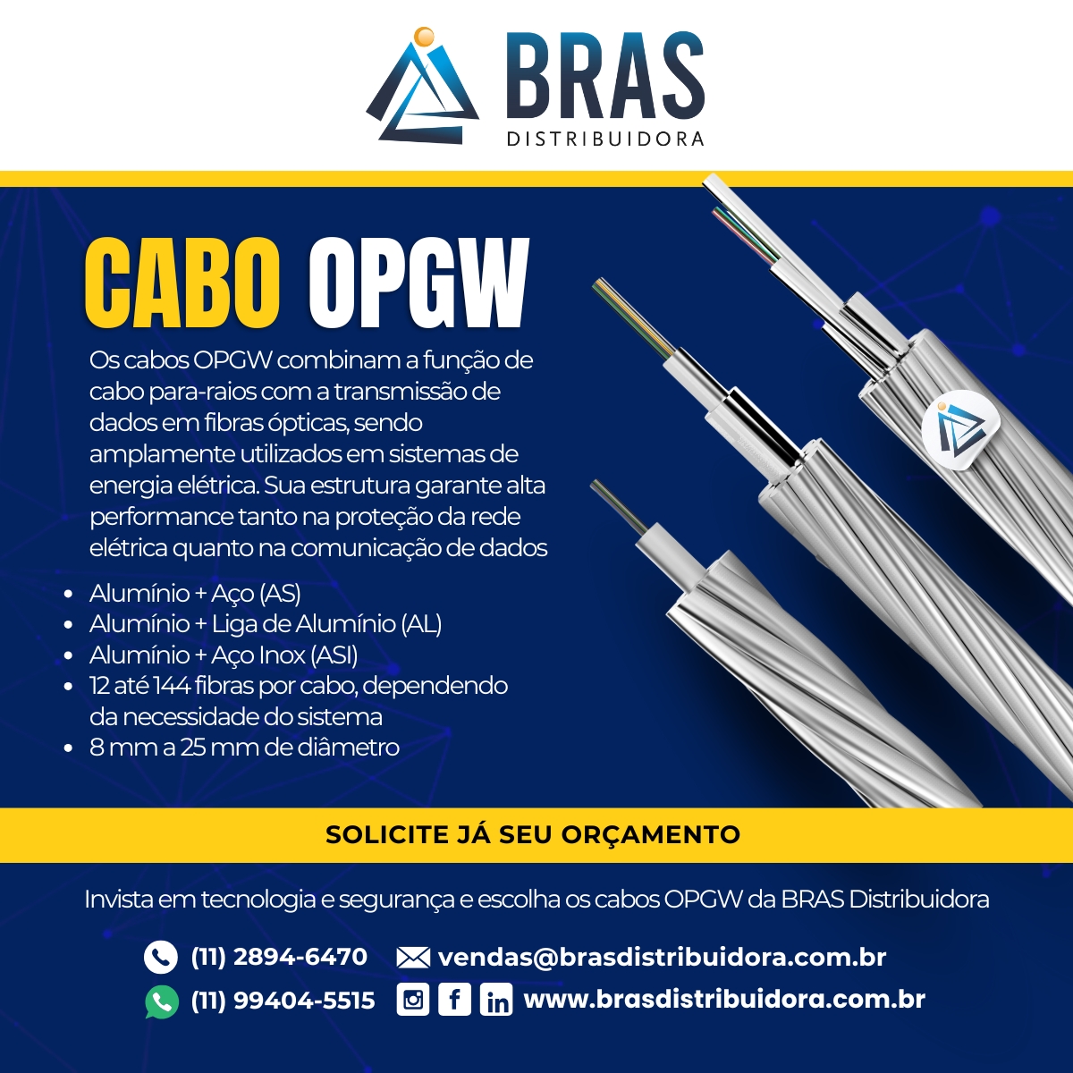 A Bras Distribuidora é uma empresa que oferece soluções completas em cabo OPGW, com modelos variados e especificações para diferentes aplicações. Temos parcerias com fabricantes certificados, garantindo qualidade, rastreabilidade e conformidade com normas nacionais e internacionais.