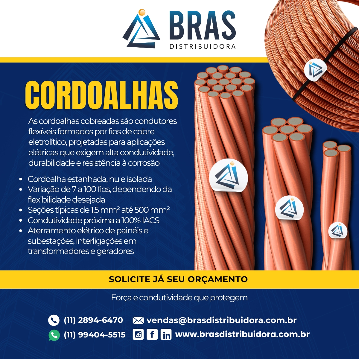 A Bras Distribuidora é referência no mercado nacional na venda de cordoalha cobreada